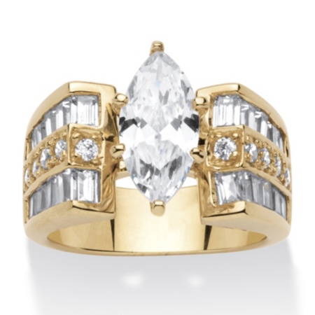 High intensity sparkle and glow - our marquise-cut cubic zirconia ring hits all the latest fashion points with a contemporary design dazzled by round and baguette cubic zirconia accents. Featuring 4 carats T.W. 14k gold over sterling silver. Metal Information- 14k Gold Silver Over Silver